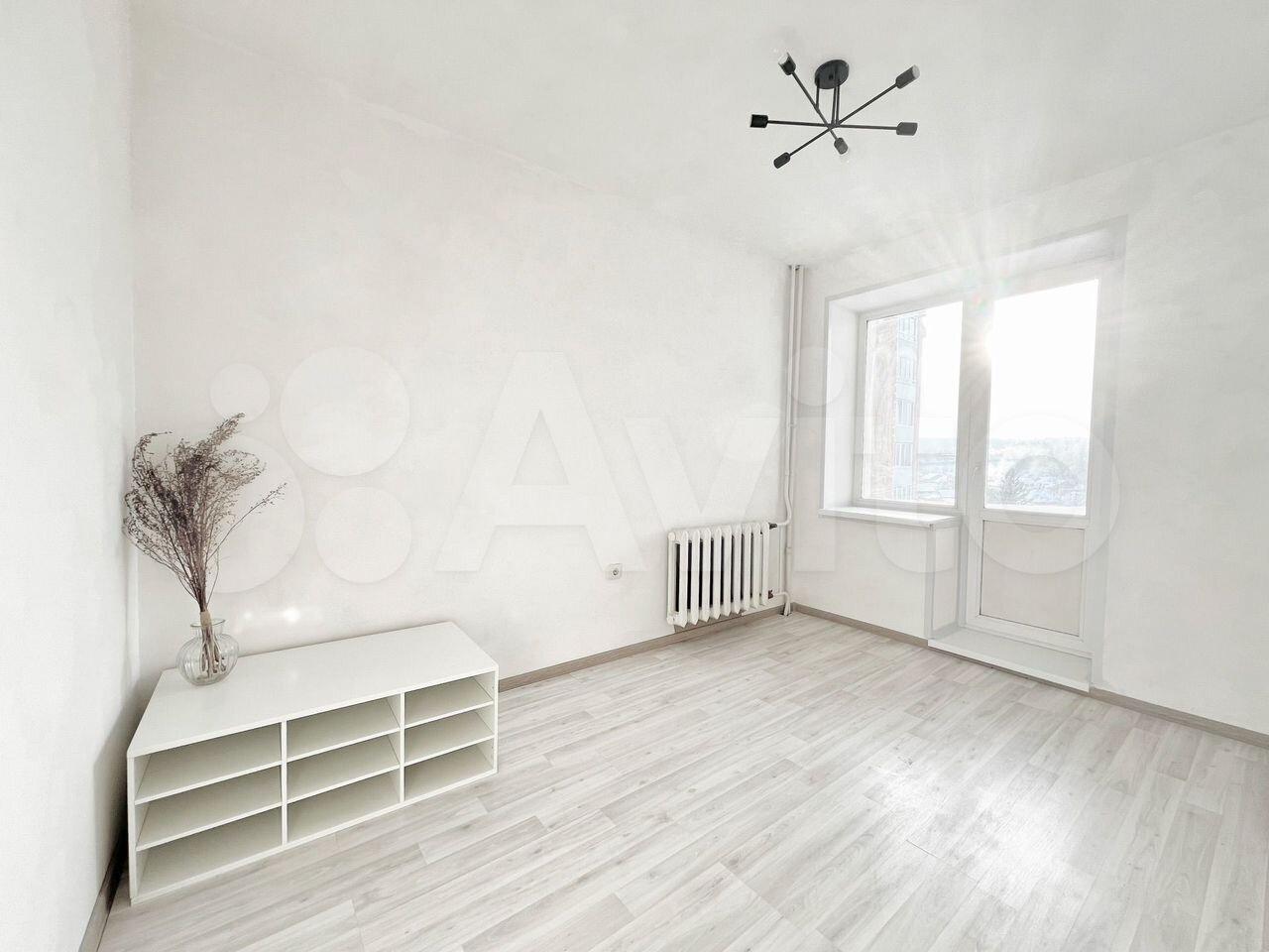 Peмoнт. Стeны в белой финишнoй штукaтуркe, нa полу светлo-серый ламинaт - везде одинaкoвый, белый плинтус.