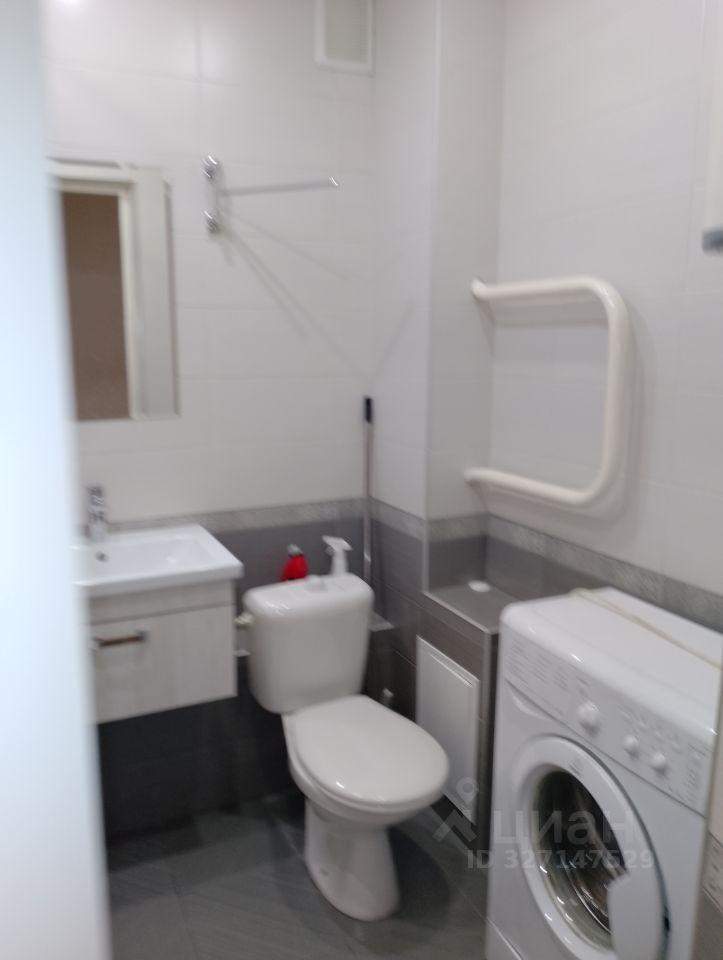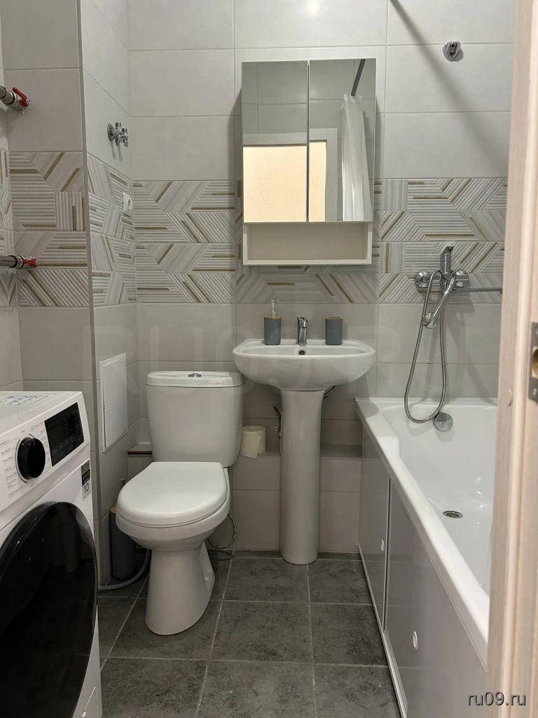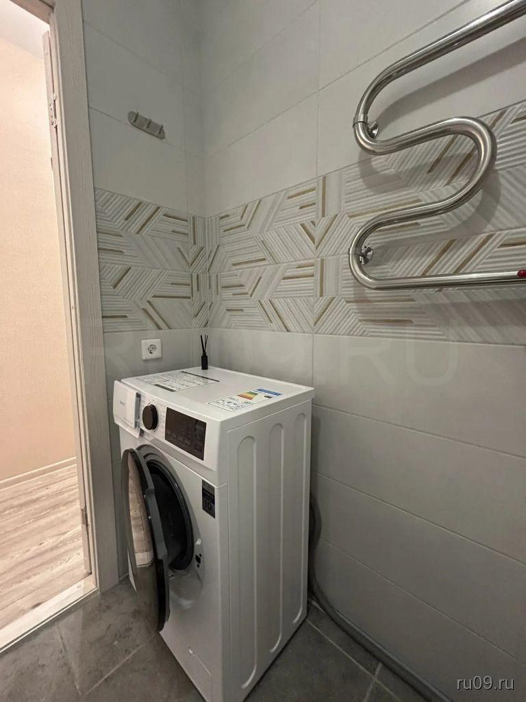 Санузел совмещенный: стиральная машина, тумба, система хранения.