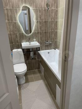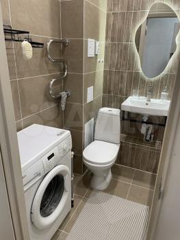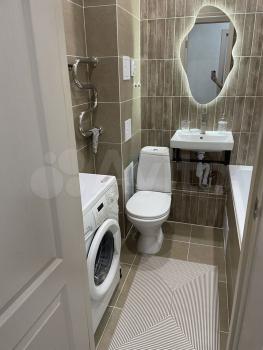 Санузел совмещённый, оформлен в современном стиле, имеется стиральная машина. Из окон открывается приятный вид на двор и детскую площадку.