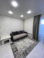 В комнате установлен телевизор и удобный диван, а также вместительные шкафы для хранения вещей. Кухня оборудована всем необходимым: холодильник, микроволновая печь и стиральная машина. Санузел совмещенный, оформлен современной плиткой.
