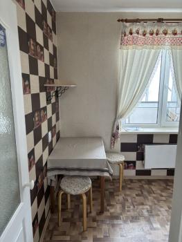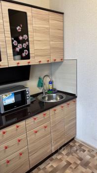 В квартире имеется: новый раскладной диван на два места, небольшой шкаф, 4 стула, гладильная доска, утюг, холодильник, СВЧ, чайник, 2-х конфорочная плита, кухонный гарнитур, стиральная машина-автомат, прихожая. Большой незастеклённый балкон.
