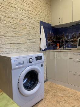 Кухня оборудована необходимой техникой, включая холодильник и плиту. Ванная комната совмещенная, оснащена ванной и стиральной машиной.
