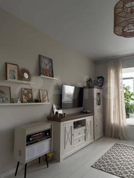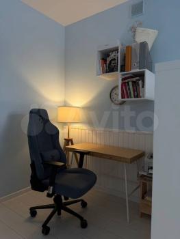 Кухня совмещена с гостиной (34 кв.м), в которой установлен телевизор на стене, стильный раскладной диван, а также консоль для рабочего места, журнальный столик. В спальне — большая кровать, шкаф и зеркало с трюмо.