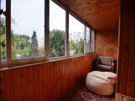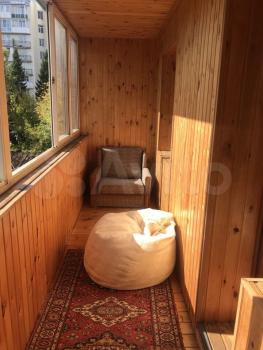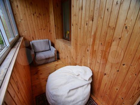 Большая лоджия отделанная деревом. В лоджии есть раскладное кресло (можно летом спать или просто чилить с книжкой), кресло-мешок, а так же большая кладовка для всякого скарба.