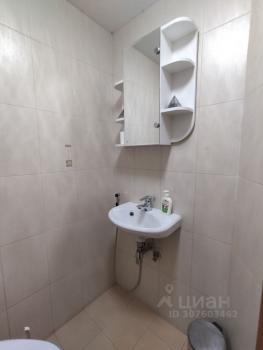 5. Туалетная комната просторная: раковина, унитаз, шкафчик с зеркалом.