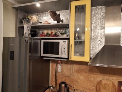 1. Комната с кухонной зоной, выход на благоустроенную лоджию. Пол красивая плитка и большой ковер, диван трансформер двухспальный с подушками, кресло, TV 47 дюймов, журнальный столик и шкафчик, большая угловая кухонная стенка с варочной поверхностью, духовкой, вытяжкой и элементами декора, стол красивый обеденный с 4 стульями, холодильник двухкамерный, микроволновка, чайник, посуда.