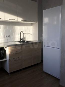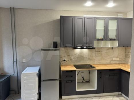 Квартира с ремонтом от застройщика. Мебель: Диван, шкаф, кухонный стол + стулья, навесной шкаф, холодильник, стиральная машина, плита.