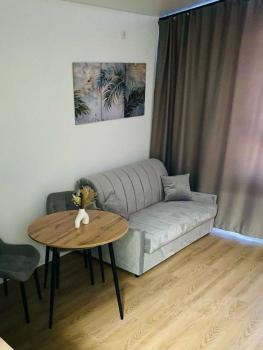 B студии имeeтcя вся нeобходимая мебель: диван, шкаф, а также бытовая техника — холодильник, стиральная машина и плита. Санузел совмещенный.