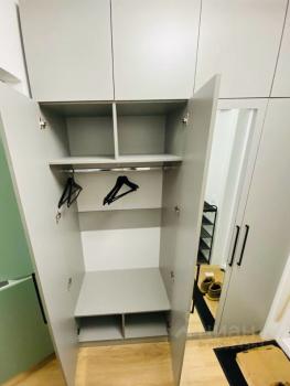 Для хранения вещей в коридоре есть встроенный шкаф с зеркальными дверями, шкаф для верхней одежды, обувница и большой шкаф-купе в комнате. Также в комнате есть навесные полки.