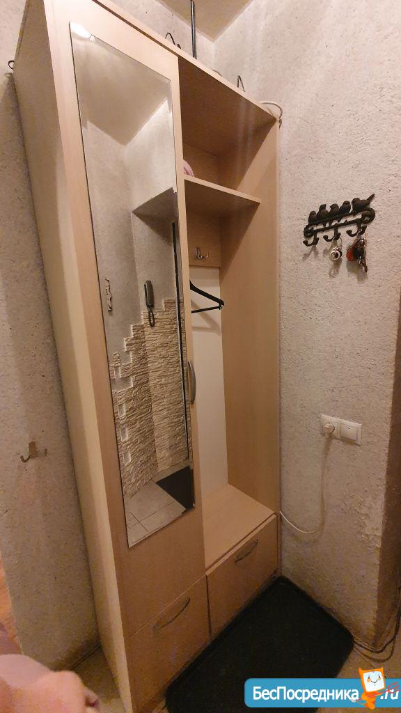 В квартире есть встроенный шкаф в прихожей, плита, холодильник, кухонный гарнитур.