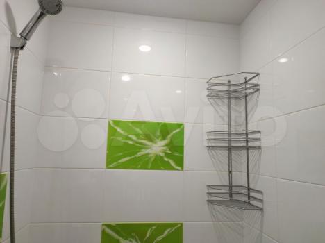 Ванная комната выложена кафелем, есть две полочки.