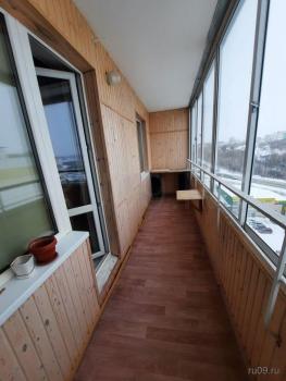 Из комнаты выход на большую лоджию (юго-восточная сторона), обшитую деревом и видом на лес, где можно летом прекрасно проводить время.