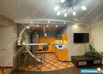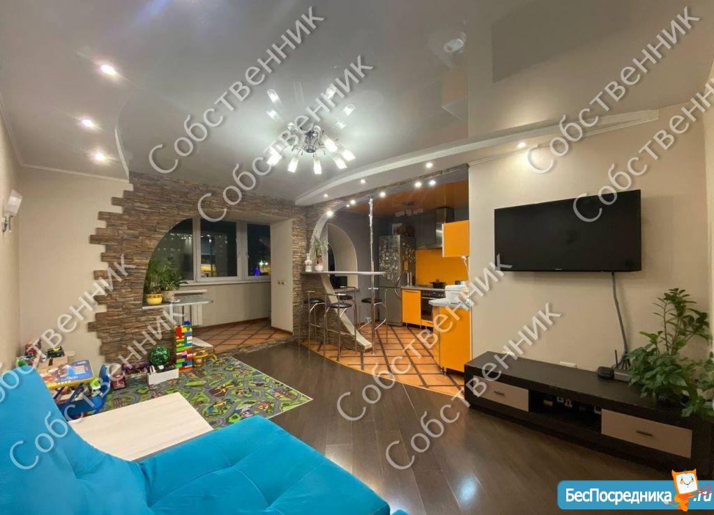 В зале: диван, разбирающийся в 2 спальных места, телевизор, тумба под телевизиром, детский ковер, стол трасформер (обеденный/журнальный), На кухне: кухонный гарнитур, печь, варочная панель, холодильник, чайник, фильтр с обратным осмосом, барная стойка, 4 барных стула, посуда