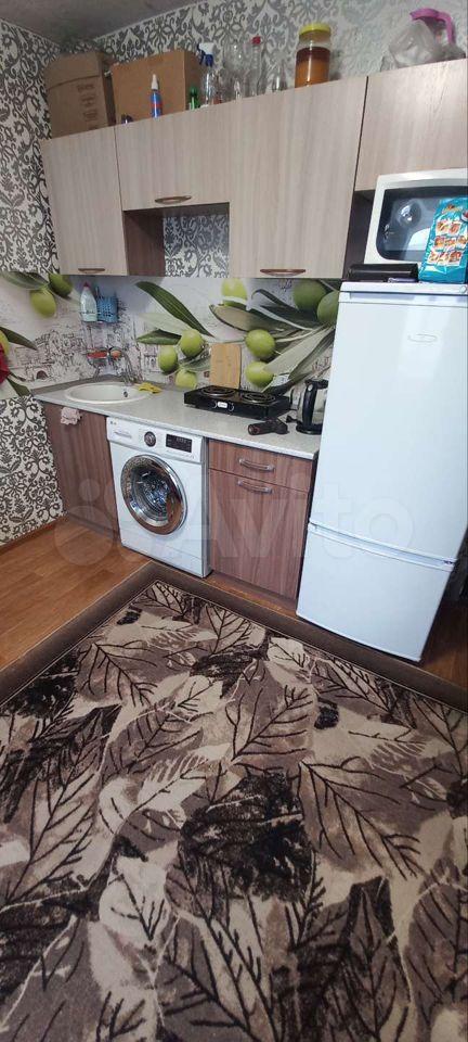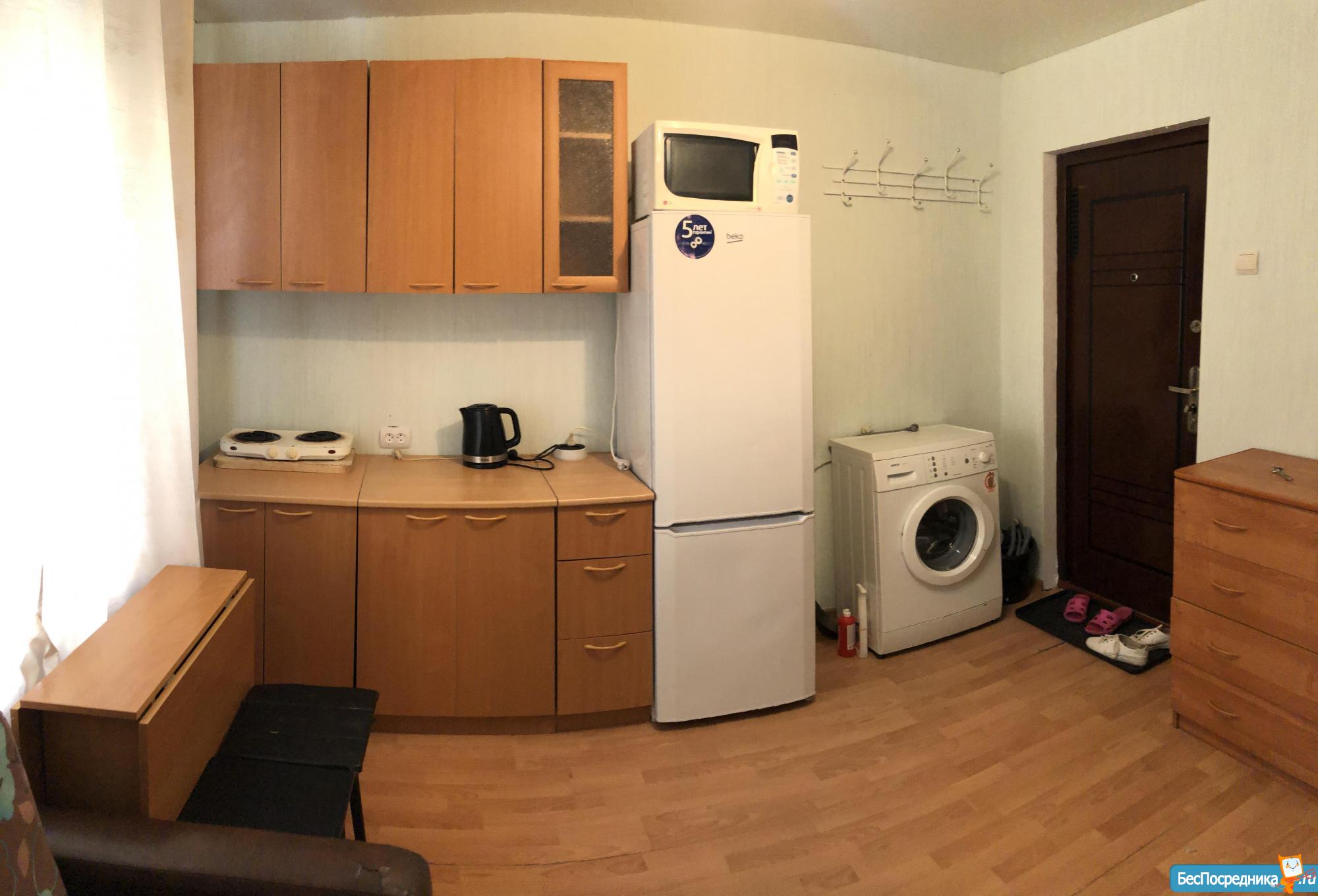 В комнате есть диван, стиральная машинка, холодильник стол, кухонный гарнитур.