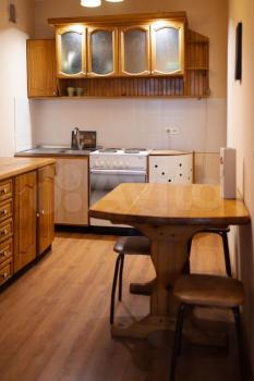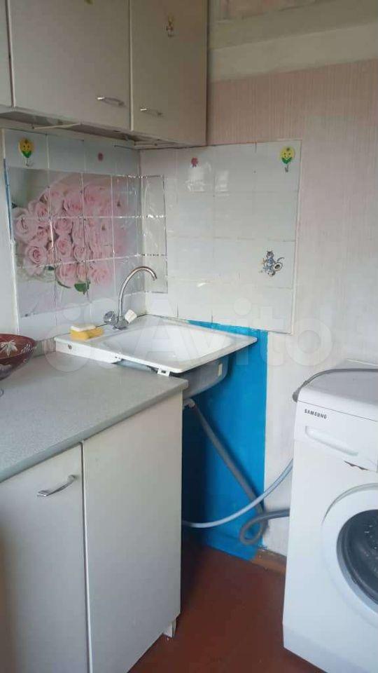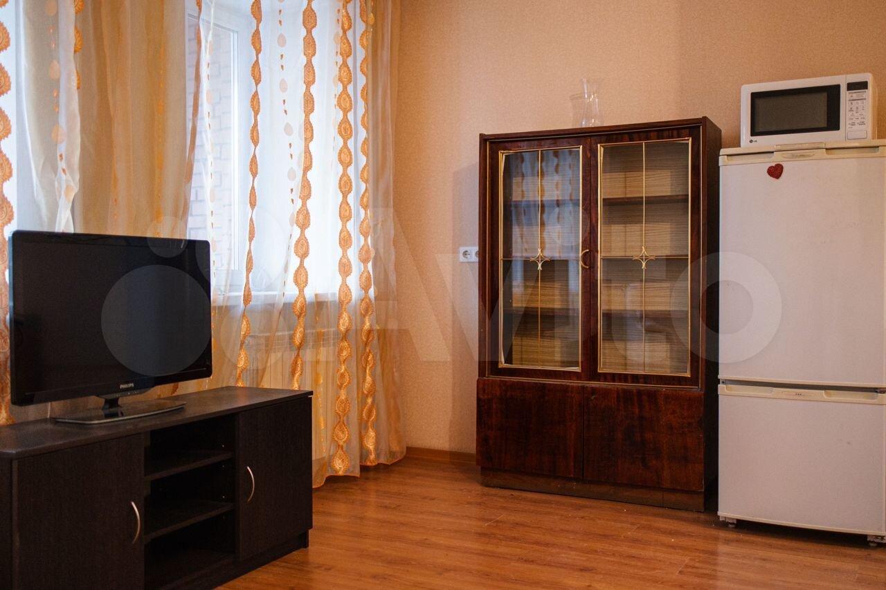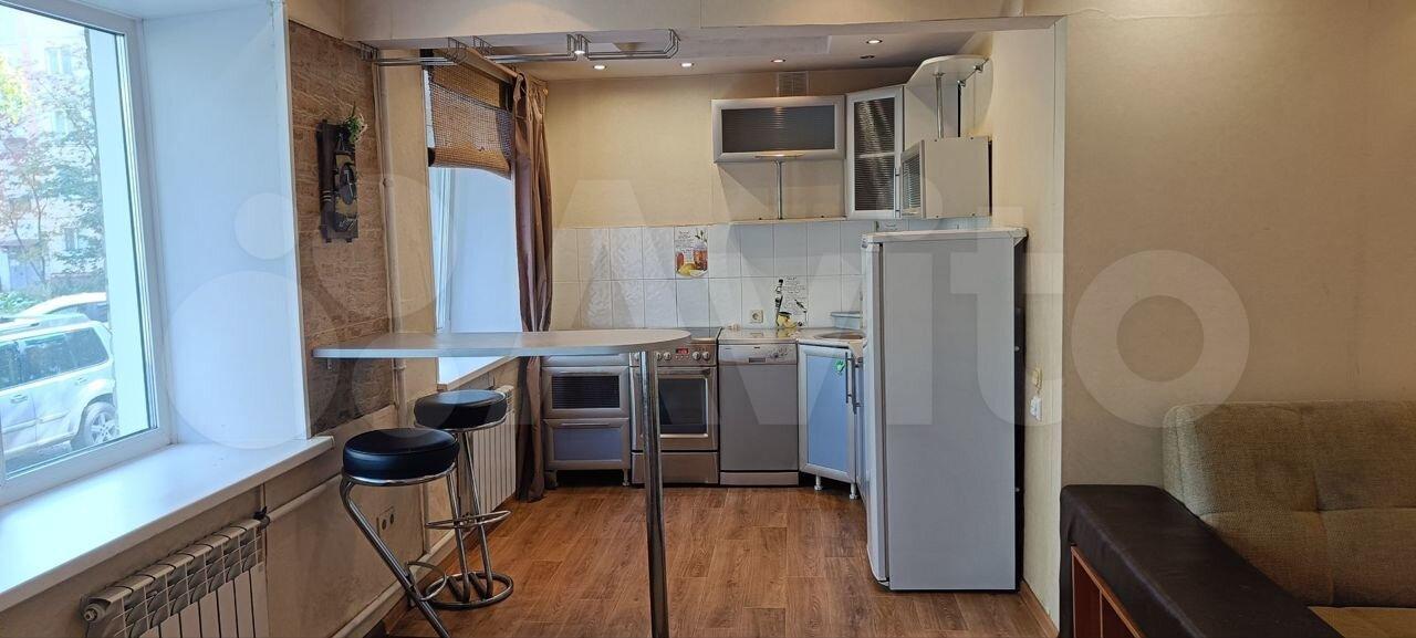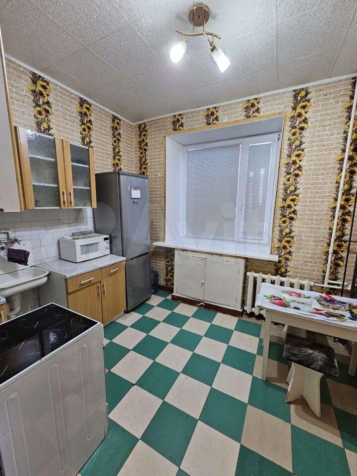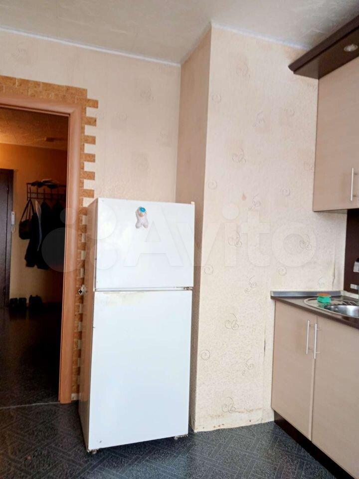 Есть кровать, шкаф, стиральная машинка, холодильник, кухонный гарнитур.