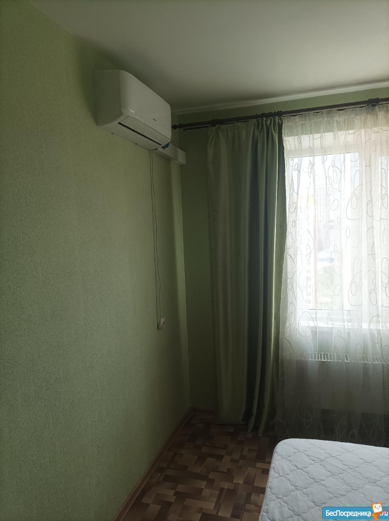 В квартире есть все для комфортного проживания: гардеробная в прихожей, огромный шкаф купе, полностью оборудованная кухня, стиральная машина, телевизор, большой балкон с чудесным видом и даже кондиционер.