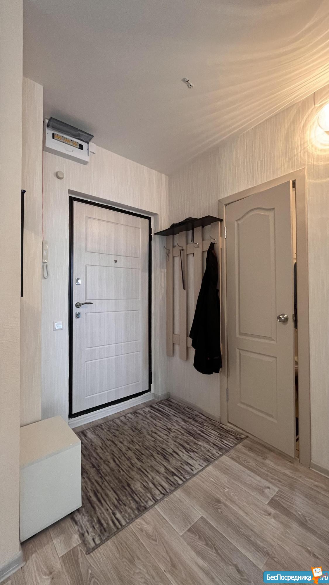 В коридоре: вместительная прихожая, зеркало, вешалка, коврик.