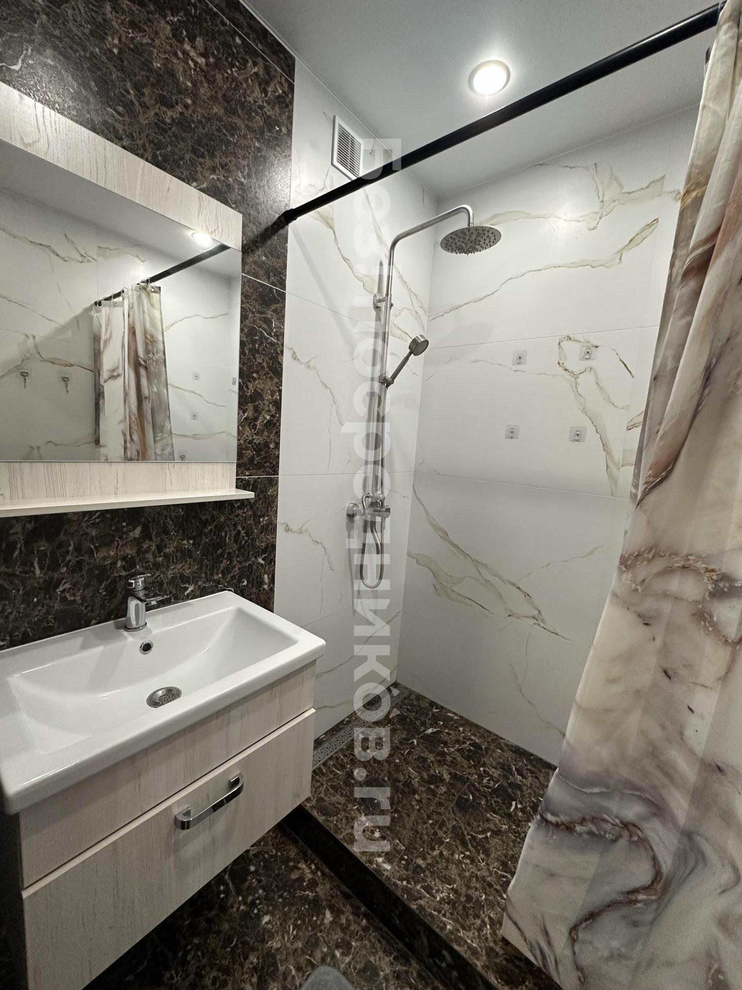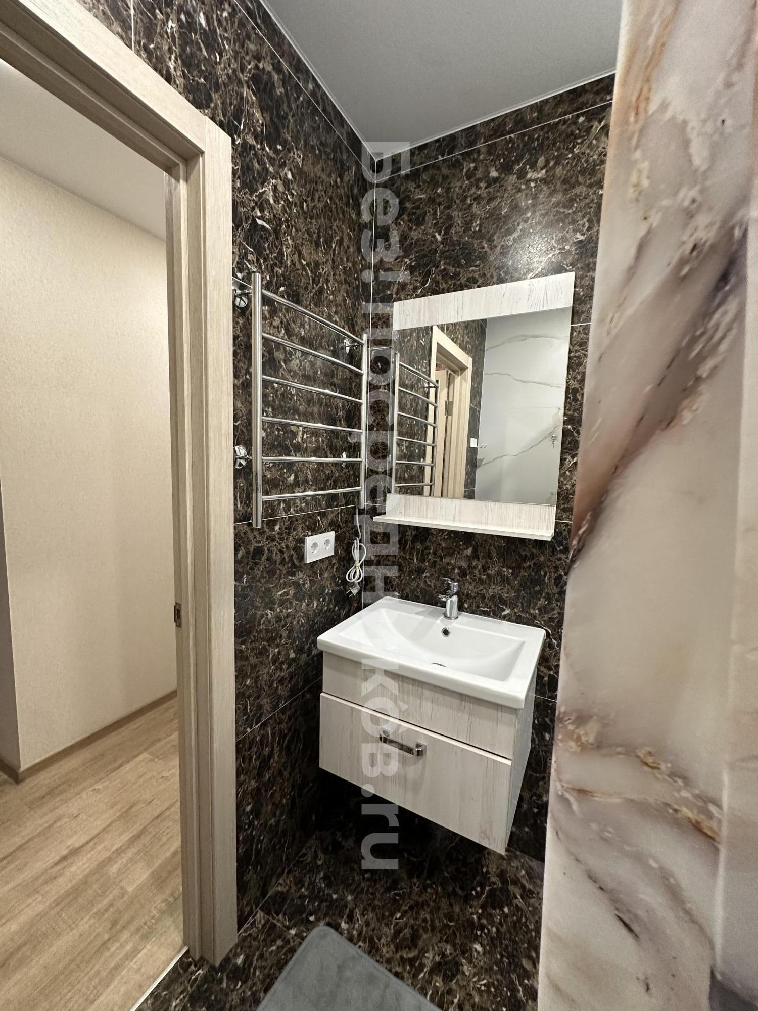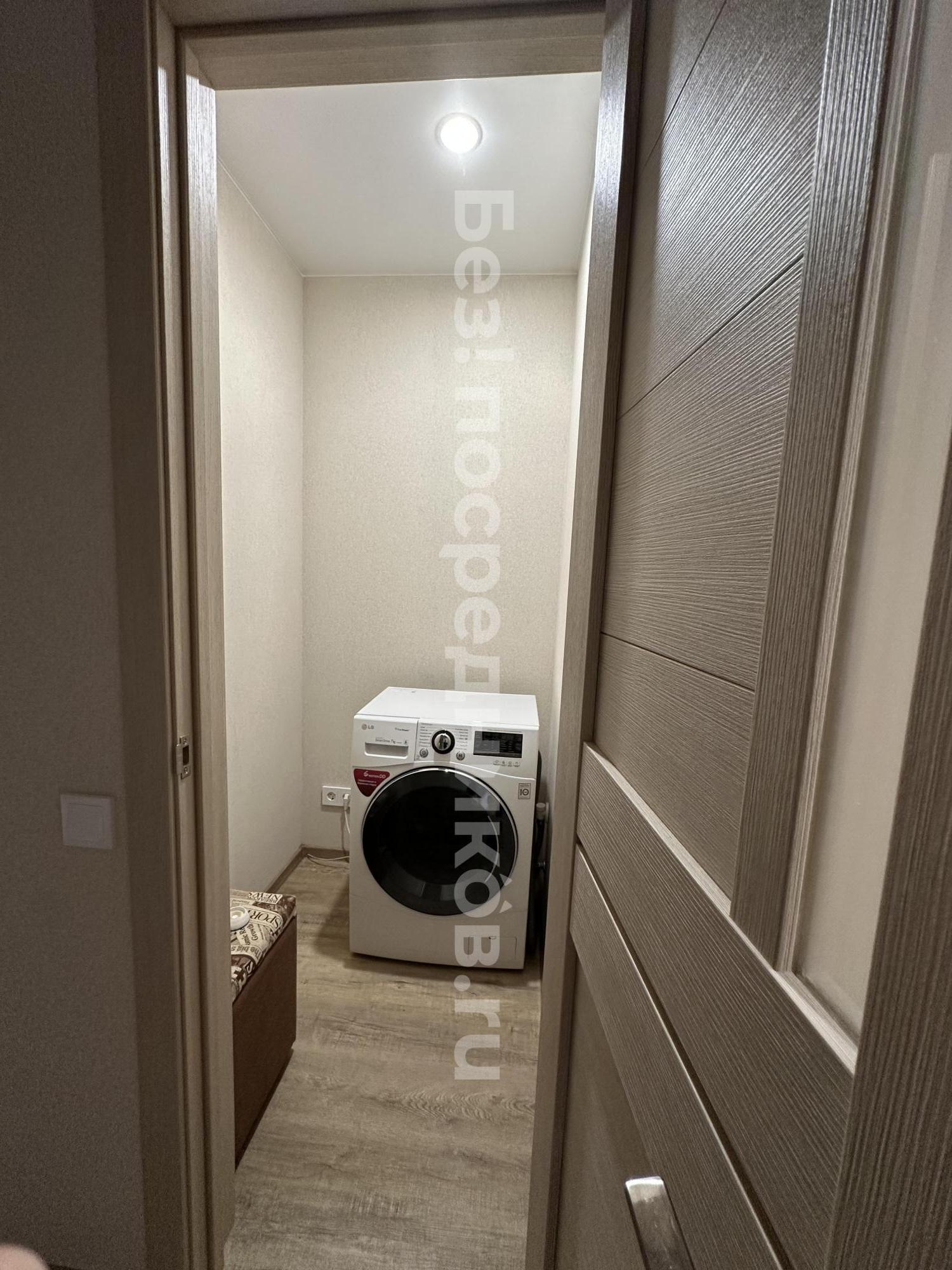 Сделан свежий ремонт, есть все необходимое для жизни: кухня, стол и стулья, плита, холодильник, стиральная машина, диван, телевизор, большая кровать, шкафы для хранения. В санузле и ванной комнате положена плитка, на входе теплый пол, по всей квартире натяжной потолок, просторная лоджия.
