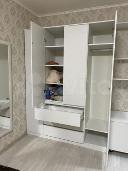 - В комнате раскладной диван, вместительный шкаф, зеркало, компьютерный и обеденный стол.