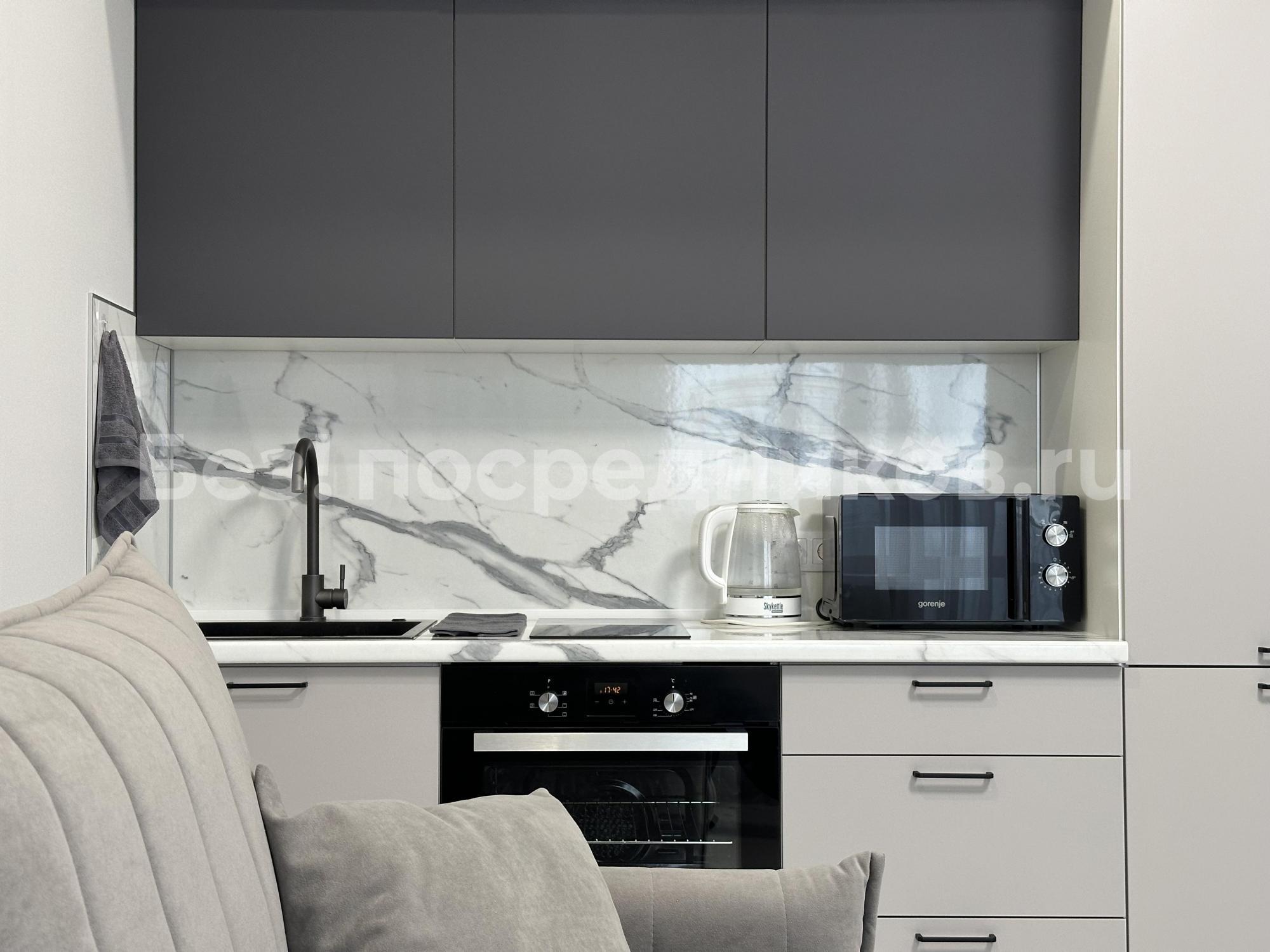 укомплектованный кухонный гарнитур с посудой и необходимой техникой(встроенная плита,духовой шкаф,СВЧ-печь,чайник,встроенный холодильник с морозильной камерой)