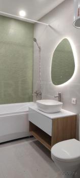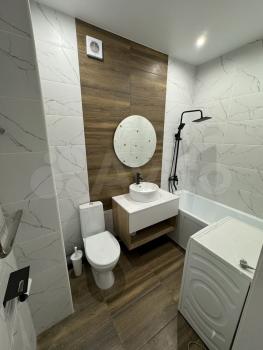Санузел совмещенный, оформлен в современном стиле с качественной сантехникой. В квартире есть шкафы для хранения вещей.
