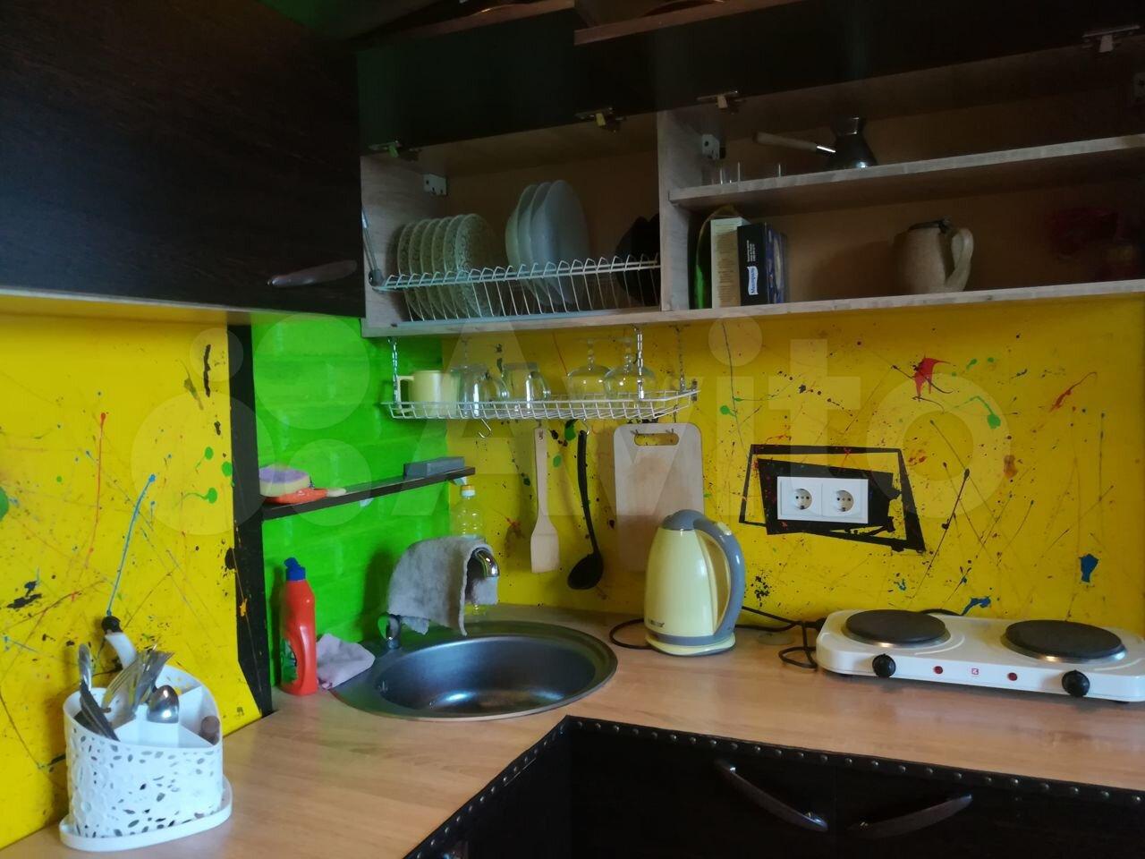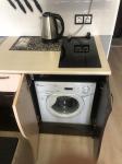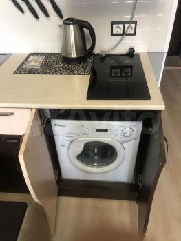 Санузел совмещенный. Встроенная душевая кабина 90*90мм с глубоким поддоном и светодиодной подсветкой струй воды. Горячее водоснабжение осуществляется через бойлер на 100л, диван-кровать 145х200 см, кухонный гарнитур, стол, барные стулья, кресло-мешок, шкафы купе, стеллаж, телевизор, компьютер для просмотра фильмов и веб-серфинга, холодильник, стиральная машина, пылесос, микроволновка, электрическая плитка, чайник, утюг, фен. Безлимитный интернет, wi-fi. Предоставляется посуда на 3 персоны.