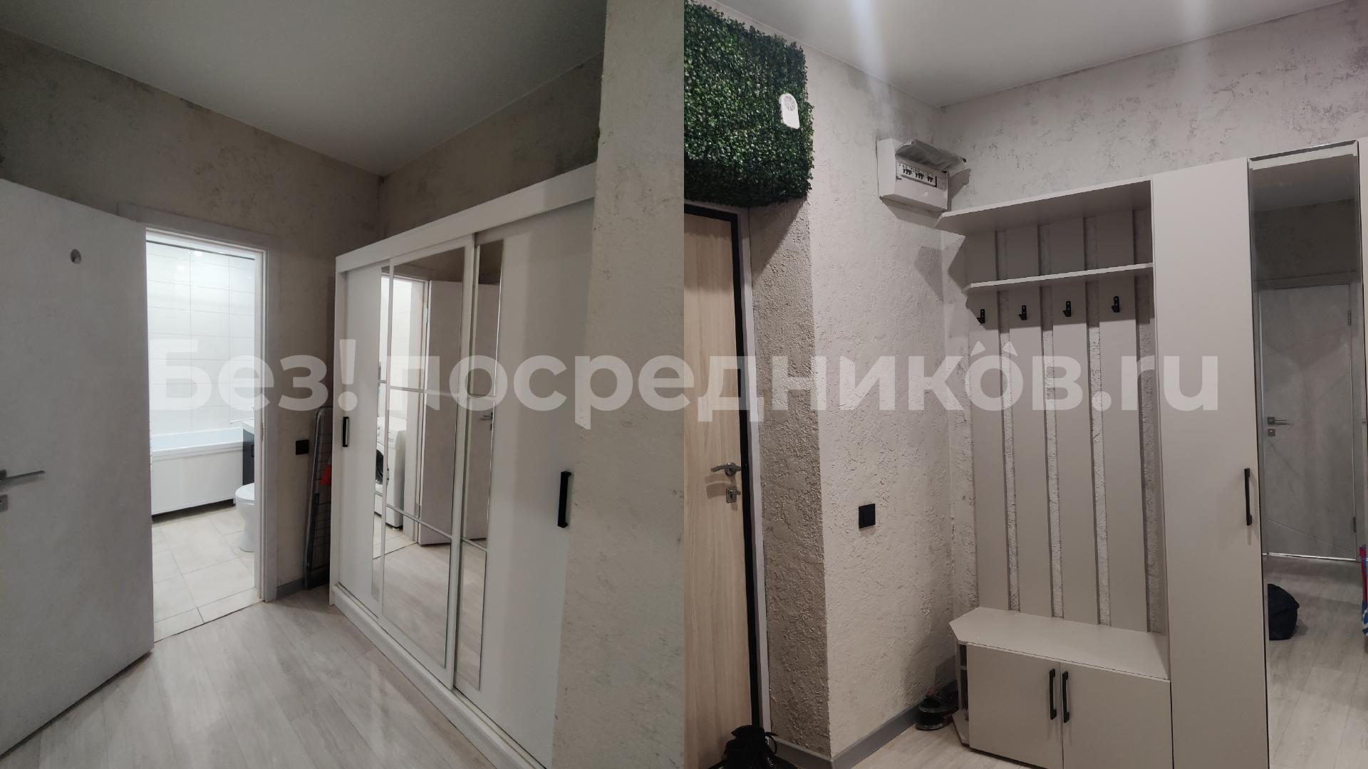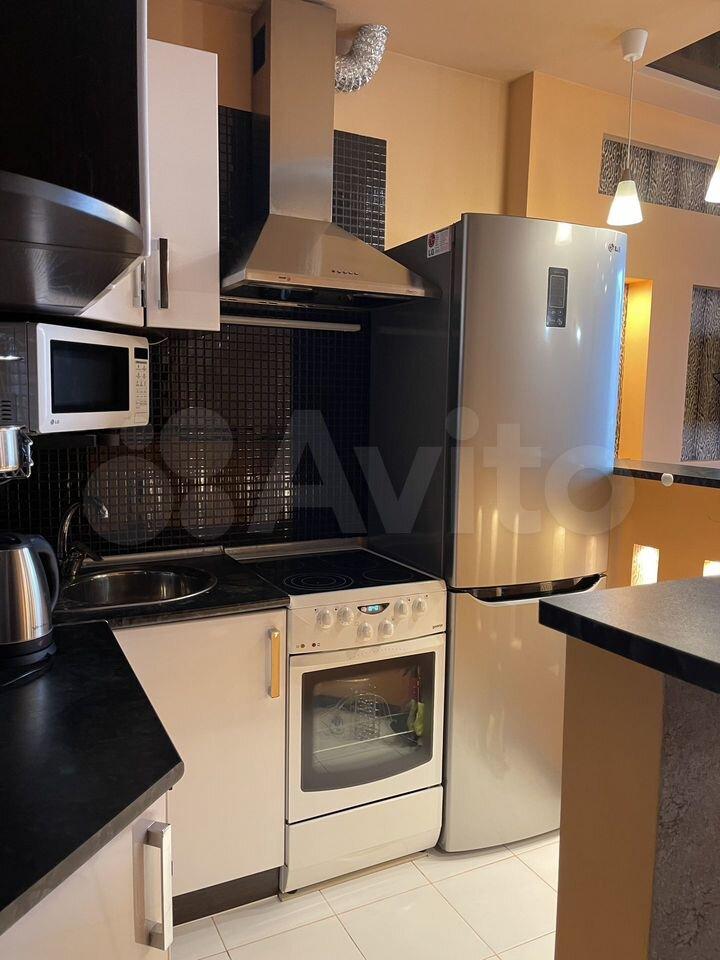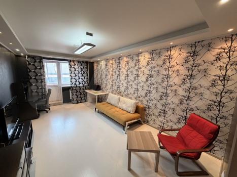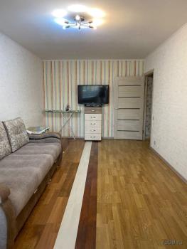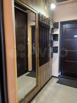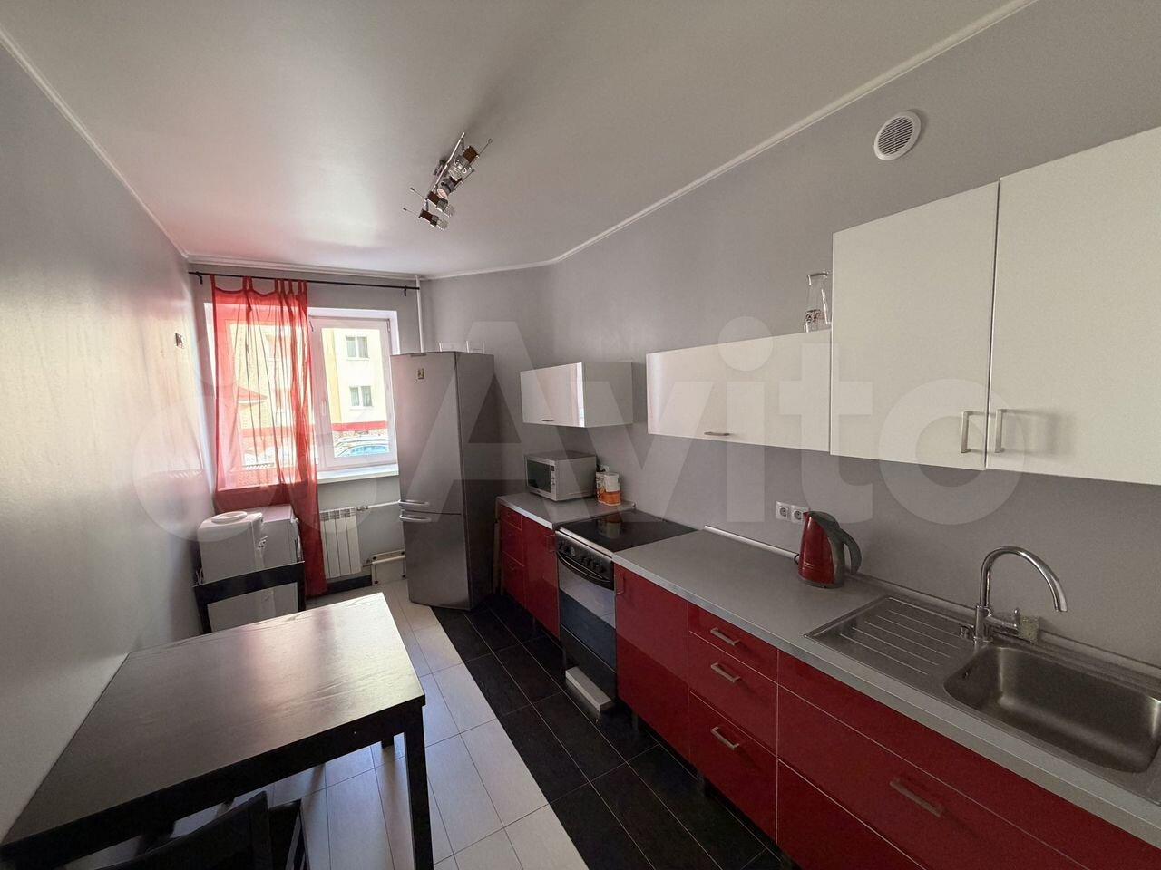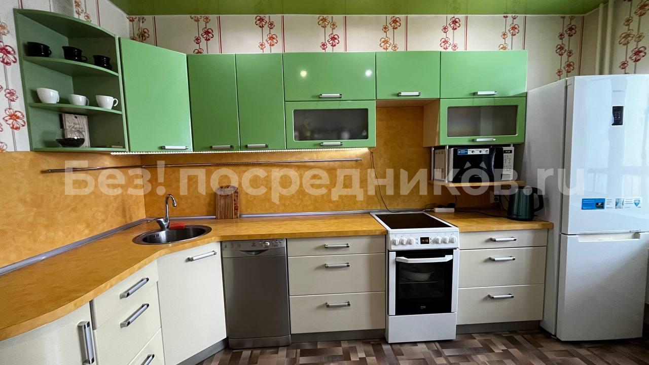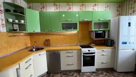 В квартире есть всё необходимое для проживания. Большой диван в гостиной, комод, телевизор. В просторной прихожей большой шкаф купе, в спальне две 1, 5-спальные кровати и шкаф-купе для хранения вещей. Санузел раздельный, имеется водонагреватель. Кухня оснащена: холодильником, плитой, микроволновой печью, вытяжкой, стиральной машинкой. Из гостиной выход на застекленную лоджию с видом на детскую площадку.