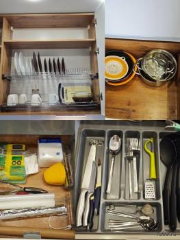 Диван (раскладывается), огромный шкаф с множеством мест для хранения, вместительный комод, письменный стол, кухонный стол и стулья, торшер, кухонный гарнитур до потолка со встроенной посудомоечной машиной, варочной панелью, вытяжкой, духовкой, микроволновая печь, холодильник, чайник.