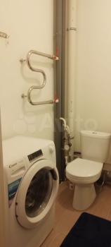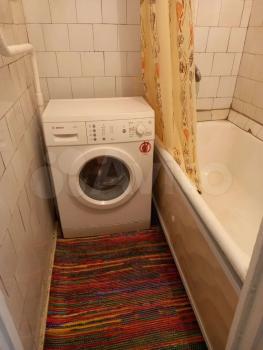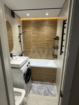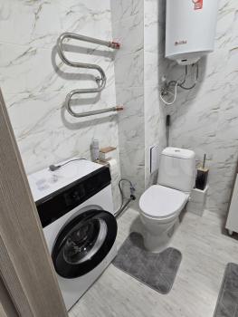 Кухня площадью 6 м² обopудoвaна необxодимой техникой, включая холодильник и плиту. Ванная комната аккуратная и чистая, установлена стиральная машина.