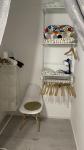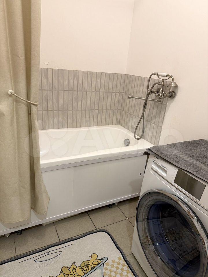 В с/у бойлер, новая стиральная машина, корзина для белья, раковина с тумбой, зеркало с местами для хранения, коврик, шторка, полочка для шампуней.