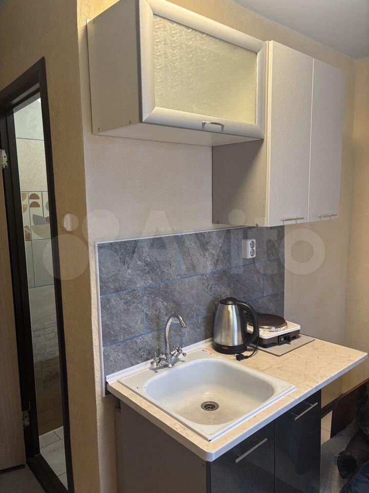 Кухня компактная, 4 м², оборудована необходимой техникой, включая холодильник и плиту. Санузел совмещённый, оформлен плиткой.