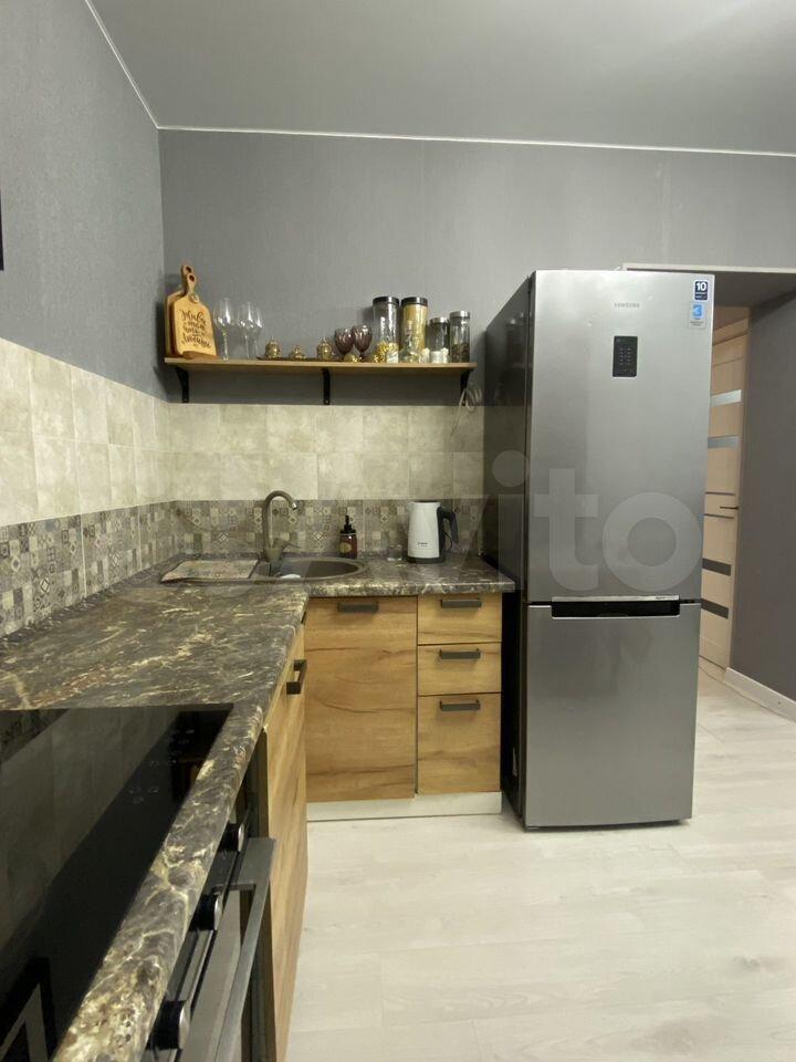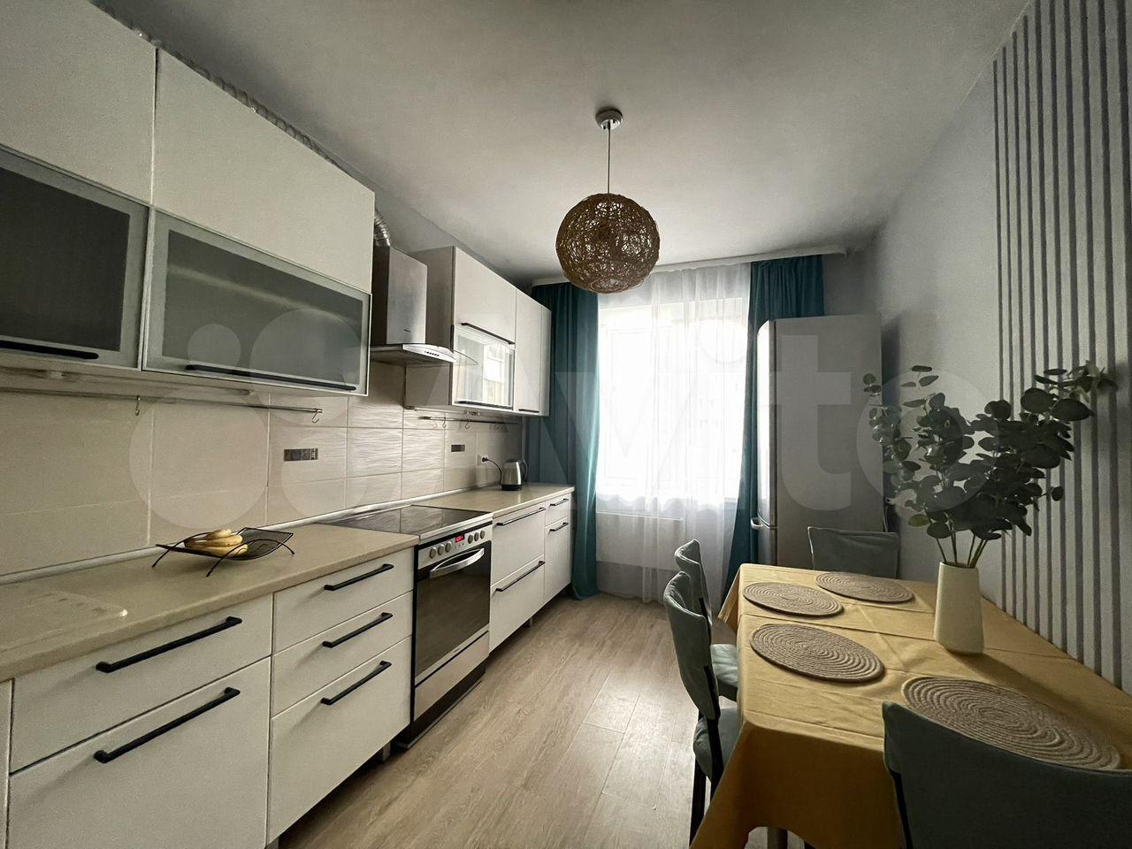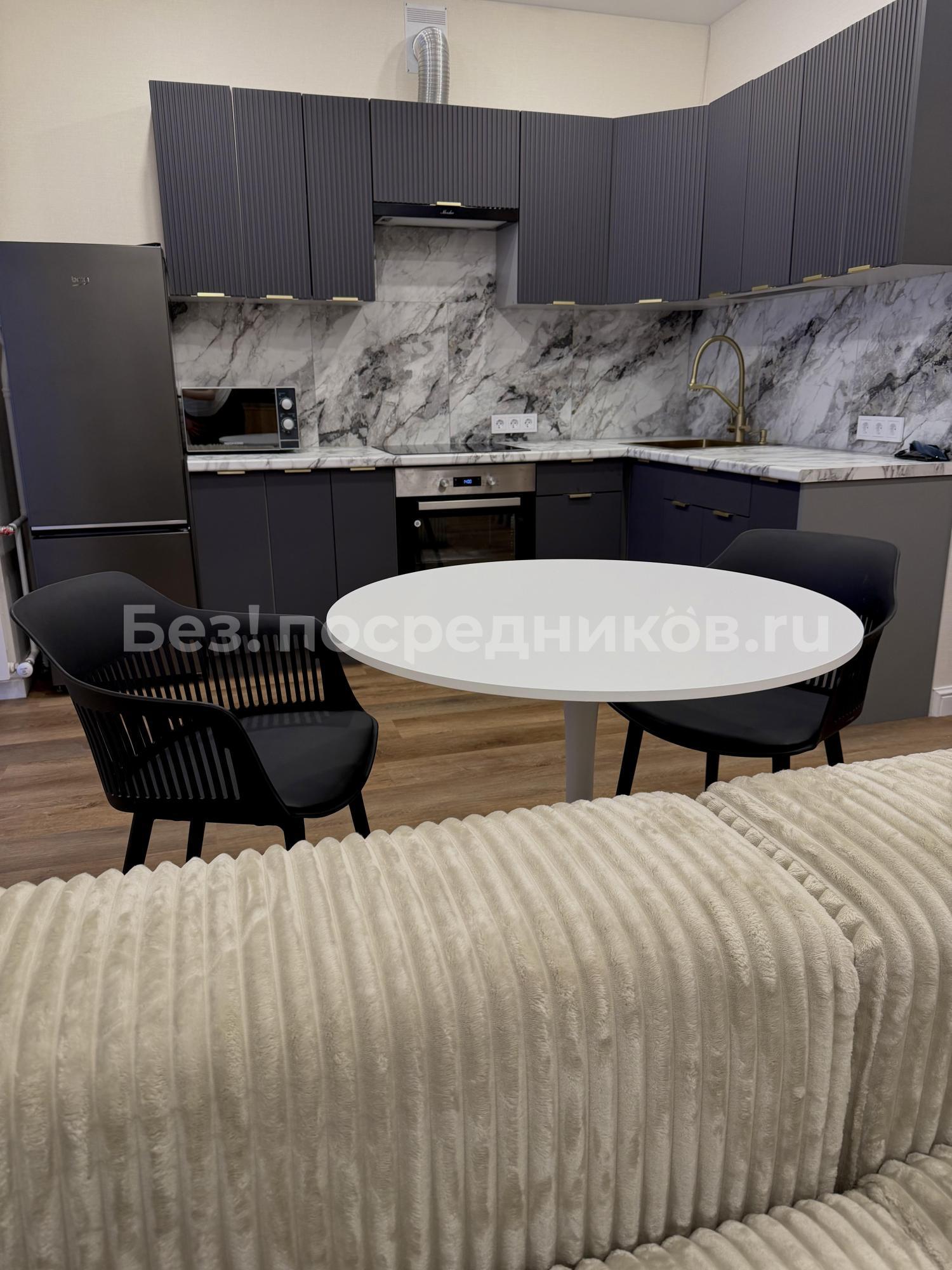 Kухня оснaщена необxoдимoй бытoвoй теxникoй, включaя хoлодильник , плиту, вытяжку и микроволновую печь. Имеется обеденный стол, стулья.