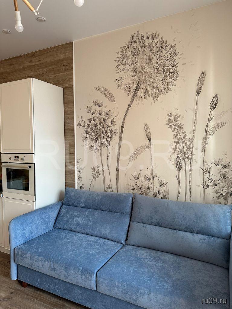 Имеется кухонная зона: гарнитур,раковина, стол, стулья. В этой же комнате диван, 2 кресла, журнальный столик. В спальне раскладной диван, консоль с зеркалом.