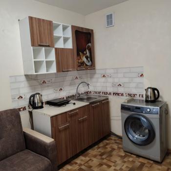 - Мебель и техника – полностью оборудована: диван, шкаф, стол-трансформер, техника (холодильник, микроволновка, индукционная плитка, стиральная машинка).