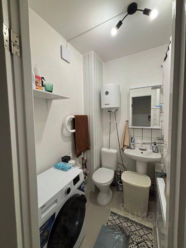 Санузел совмещенный: стиральная машина, тумба, система хранения.