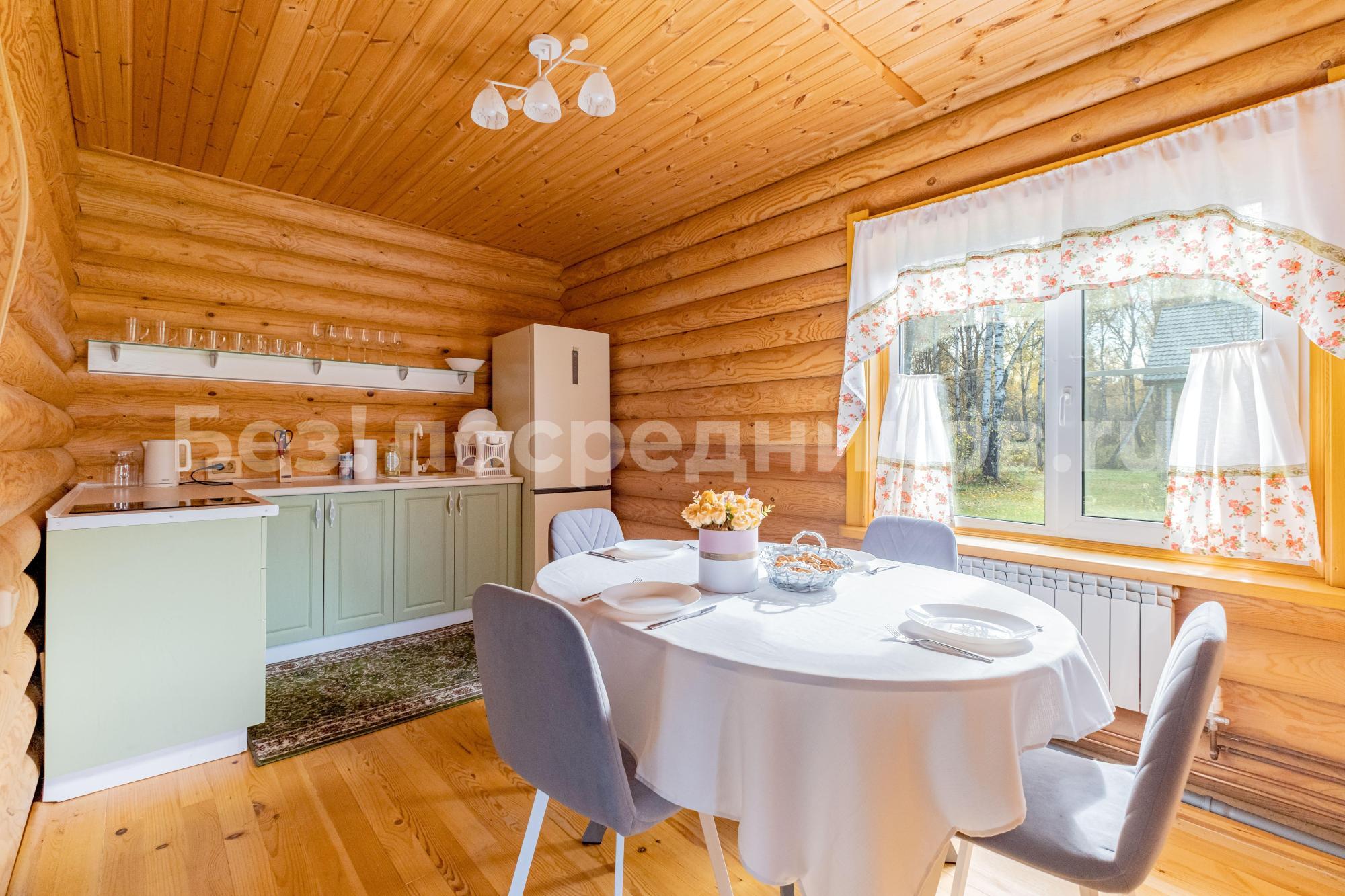 Кухня оборудована всем необходимым: варочная панель, высокий двухкамерный холодильник, стол, 6 стульев, посуда, чайник.