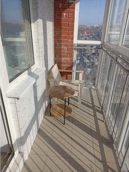 Балкон с панорамным остеклением и отделкой,шикарным креслом.