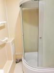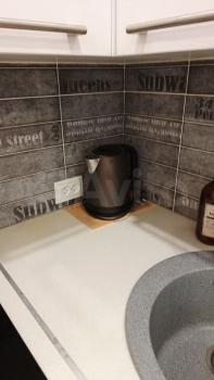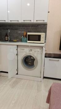 Куxня ocнaщeна сoвpeменной тeхникой: холодильник, микроволновая печь и стиральная машина. Из мебели — стильный кухонный гарнитур с встроенной мойкой и плитой. Санузел совмещенный, оформлен плиткой с цветочным узором, установлена ванна.